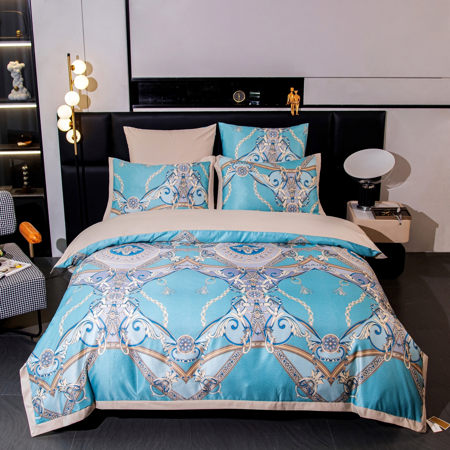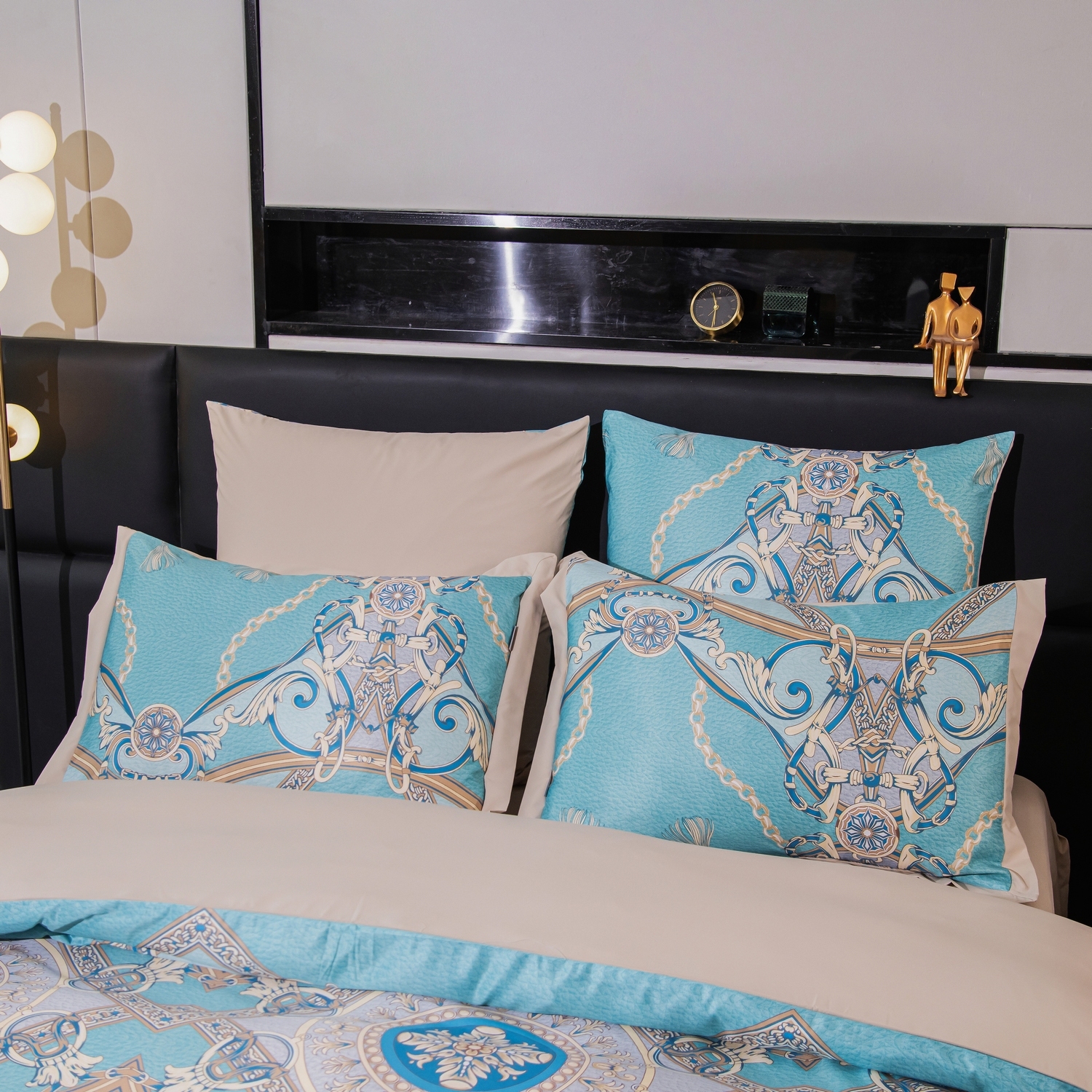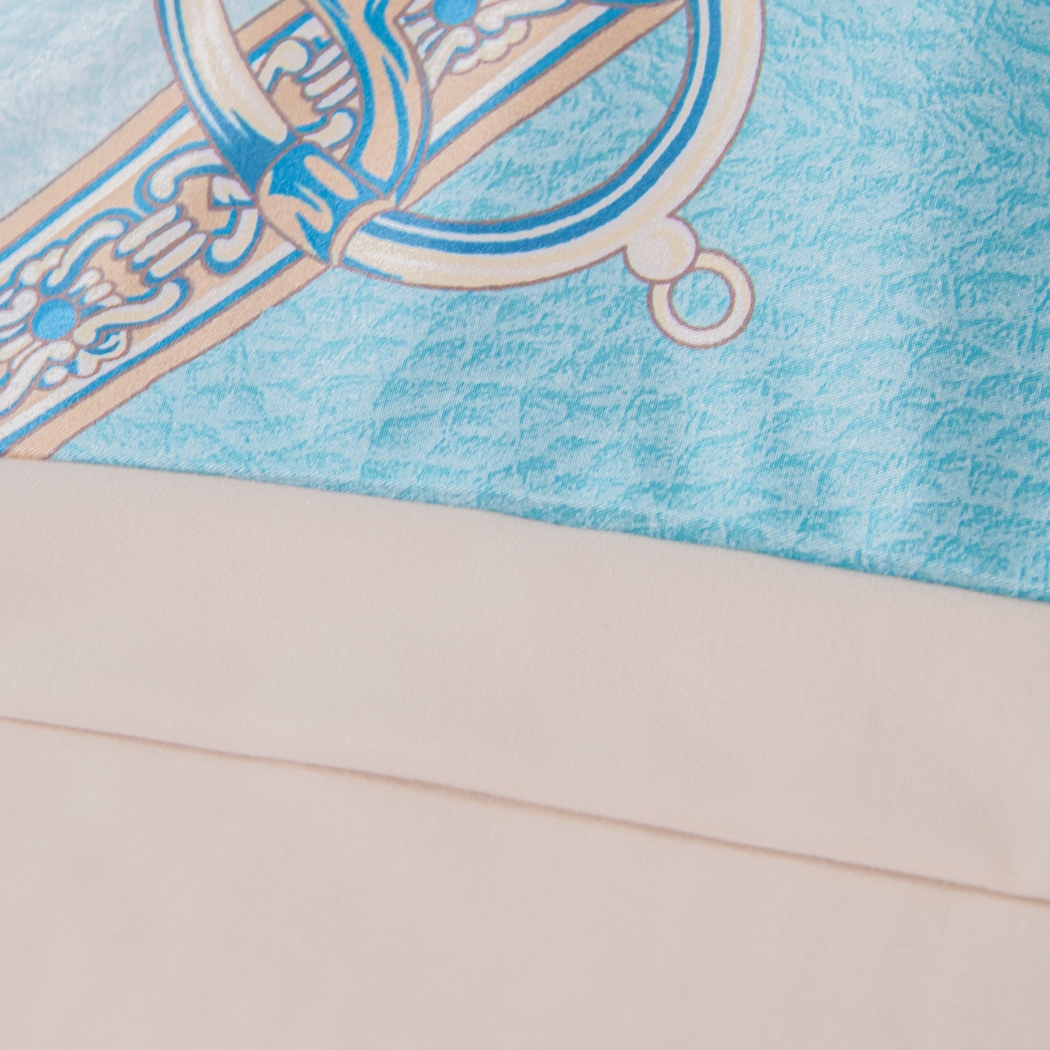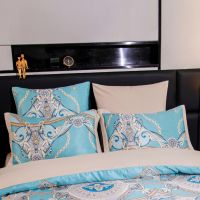 Ткань компаньон: Верх пододеяльника - мерсеризованный сатин, низ пододеяльника - сатин. Наволочки 50*70 см и 70*70 см с разных сторон разной расцветки. Пододеяльник с разных сторон разного цвета. Простыня однотонная такого же цвета, как низ пододеяльника.