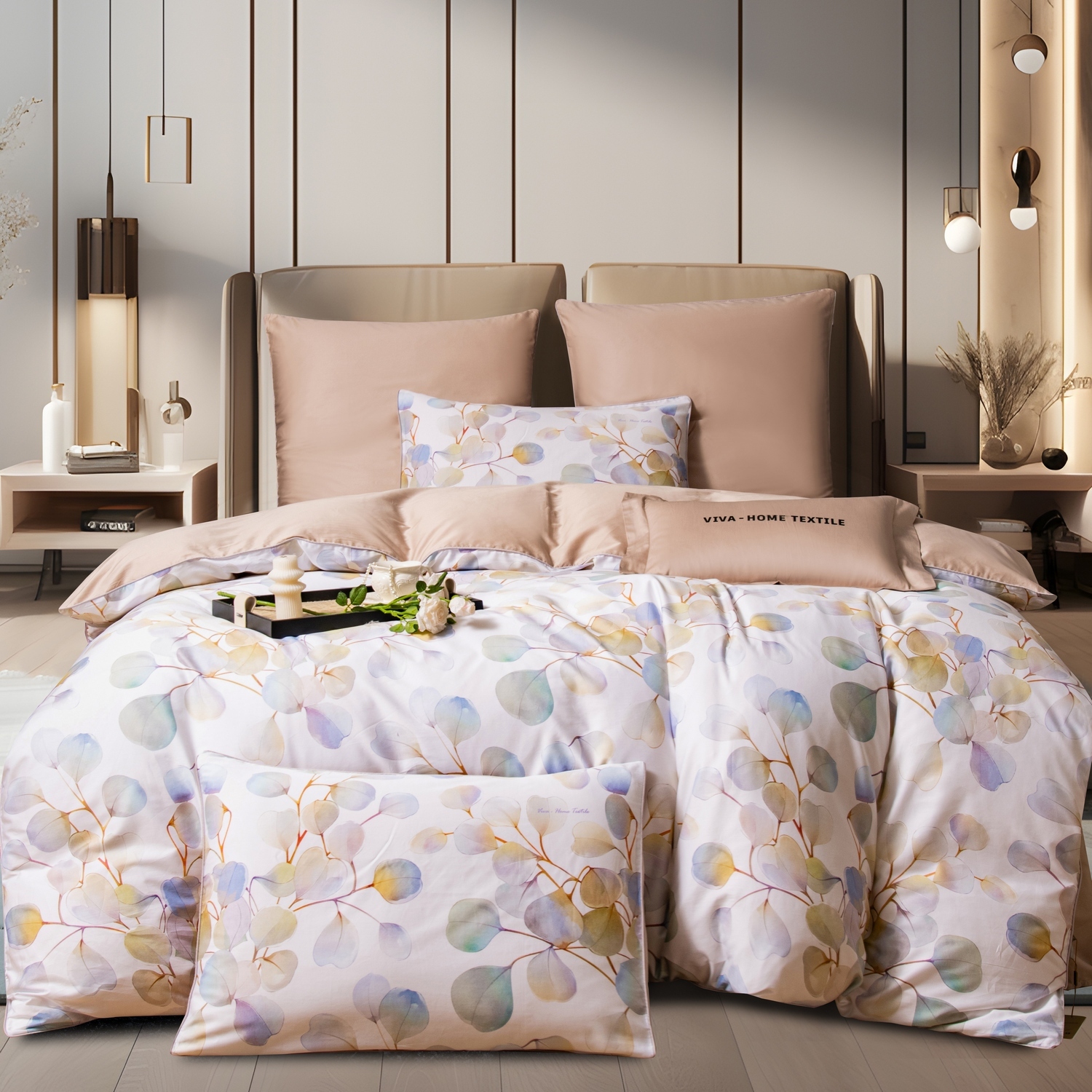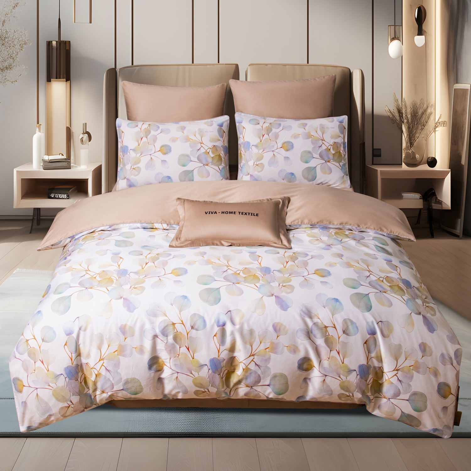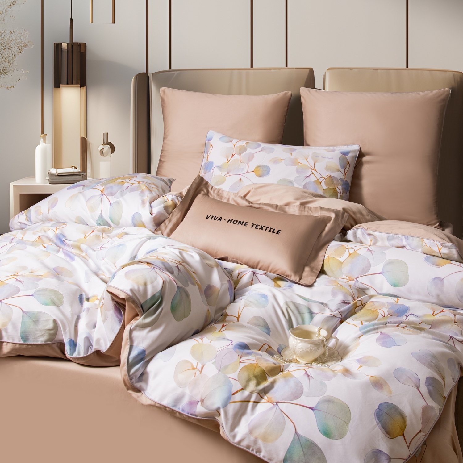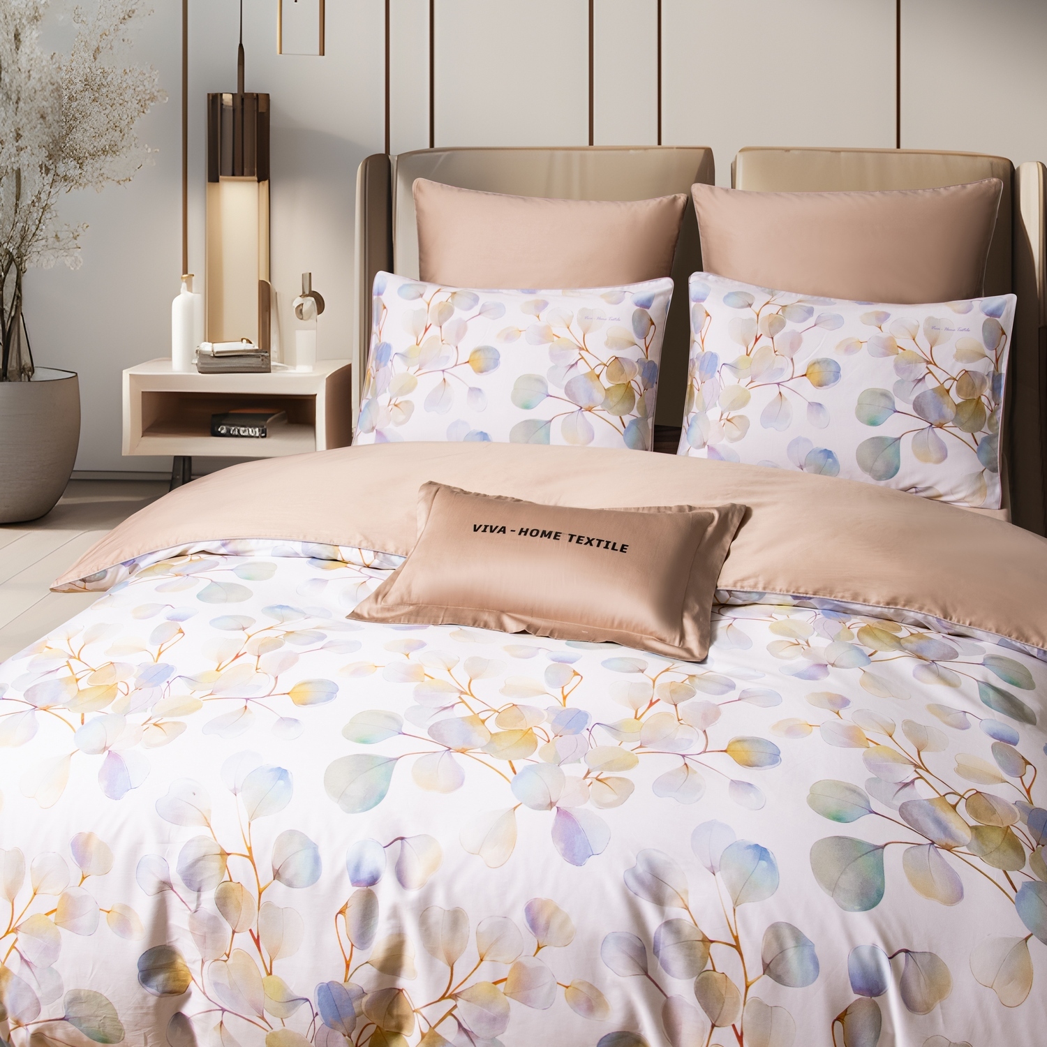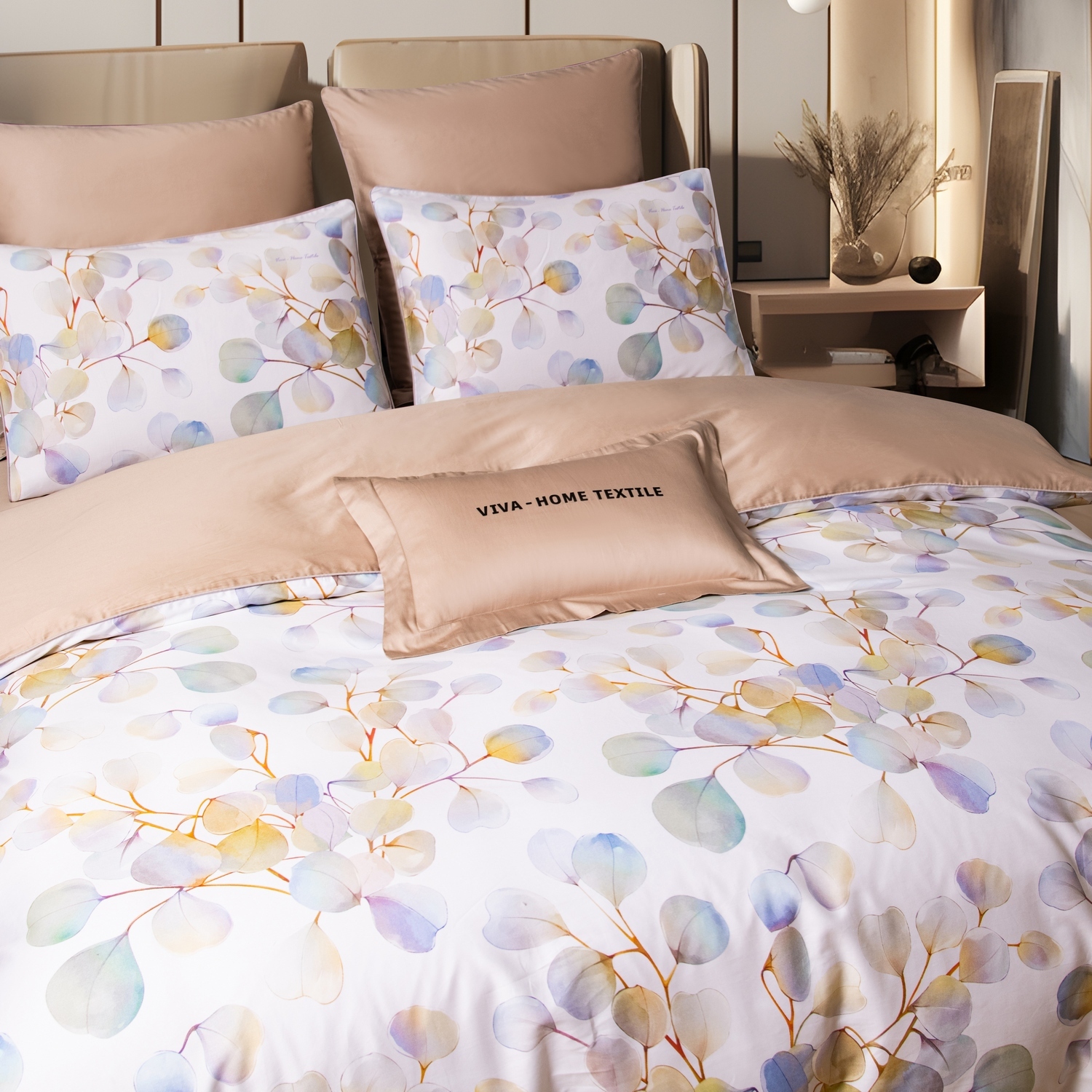 Ткань компаньон: Наволочки 50*70 с разных сторон разной расцветки, наволочки 70*70 однотонные в цвет простыни, пододеяльник с разных сторон разного цвета, простыня однотонная такого же цвета, как низ пододеяльника.